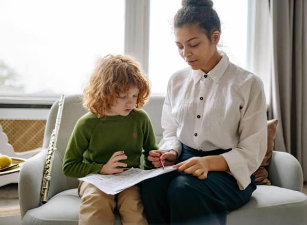 An elderly man instructs a young woman on saxophone in a cozy indoor setting.